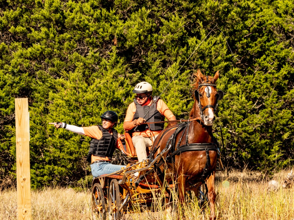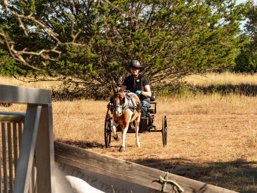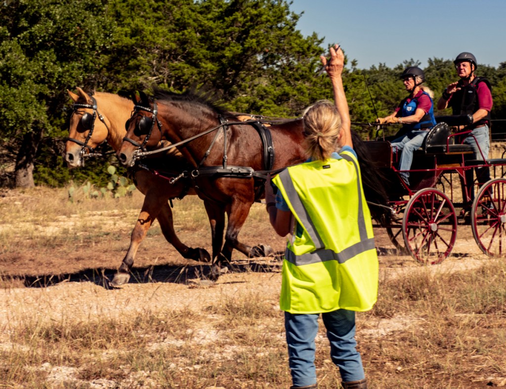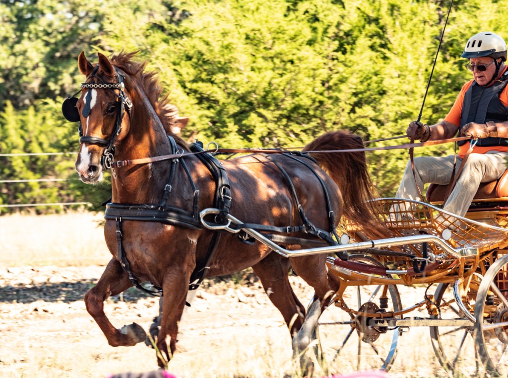 We volunteered to work at a competitive driving event eight days ago in Burnet, Texas. I had no expectations or past experience at a driving event so it was all new to me. Basically horses and buggies compete through a series of timed obstacles, some quite complex. The stop watch is triggered when the horses nose passes the post at A and stopped when the horse exits D. And, I guess some drivers are excused from entering Gate D. (Hey, I was the photographer, not the gate keeper – so don’t ask me the rules.)